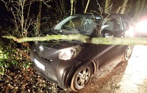 Ein umgestürzter Baum im Ortsteil Wüsten blockierte die Fahrbahn. Dabei wurde auch ein am Straßenrand abgestelltes Fahrzeug beschädigt. Der Baum wurde zerkleinert, bei Seite geräumt und der Halter des PKW durch die Polizei informiert. |