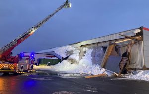 Zwei zeitgleiche Großeinsätze haben die Bad Salzufler Feuerwehr am Mittwochabend beschäftigt. Zunächst ging gegen 17.30 Uhr eine Brandmeldeanlage eines Industriebetriebs im Ortsteil Schötmar, bei der Leitstelle Lippe in Lemgo ein. Weitere Anrufer meldeten jedoch am gleichen Gebäude an der Daimlerstraße einen Hallendacheinsturz. Da zunächst nicht bekannt war, in welchem Ausmaß der Einsturz war und ob sich noch Menschen in der Firmenhalle befinden, wurde Großalarm ausgelöst. Kräfte aus dem Stadtgebiet und dem Kreis Lippe wurden zusammengezogen. Glücklicherweise bestätigte sich die erste Meldung nicht. Das 60×5 Meter große Schleppdach der Industriehalle hatte unter der Schneelast nachgegeben und zwei LKW-Sattelauflieger unter sich begraben. Menschen befanden sich glücklicherweise nicht unter den Trümmern. Die Erkundung im Inneren des Gebäudes stellten die Kräfte jedoch schnell ein: Auch das übrige Dach der Halle ist nach ersten Einschätzungen einsturzgefährdet.