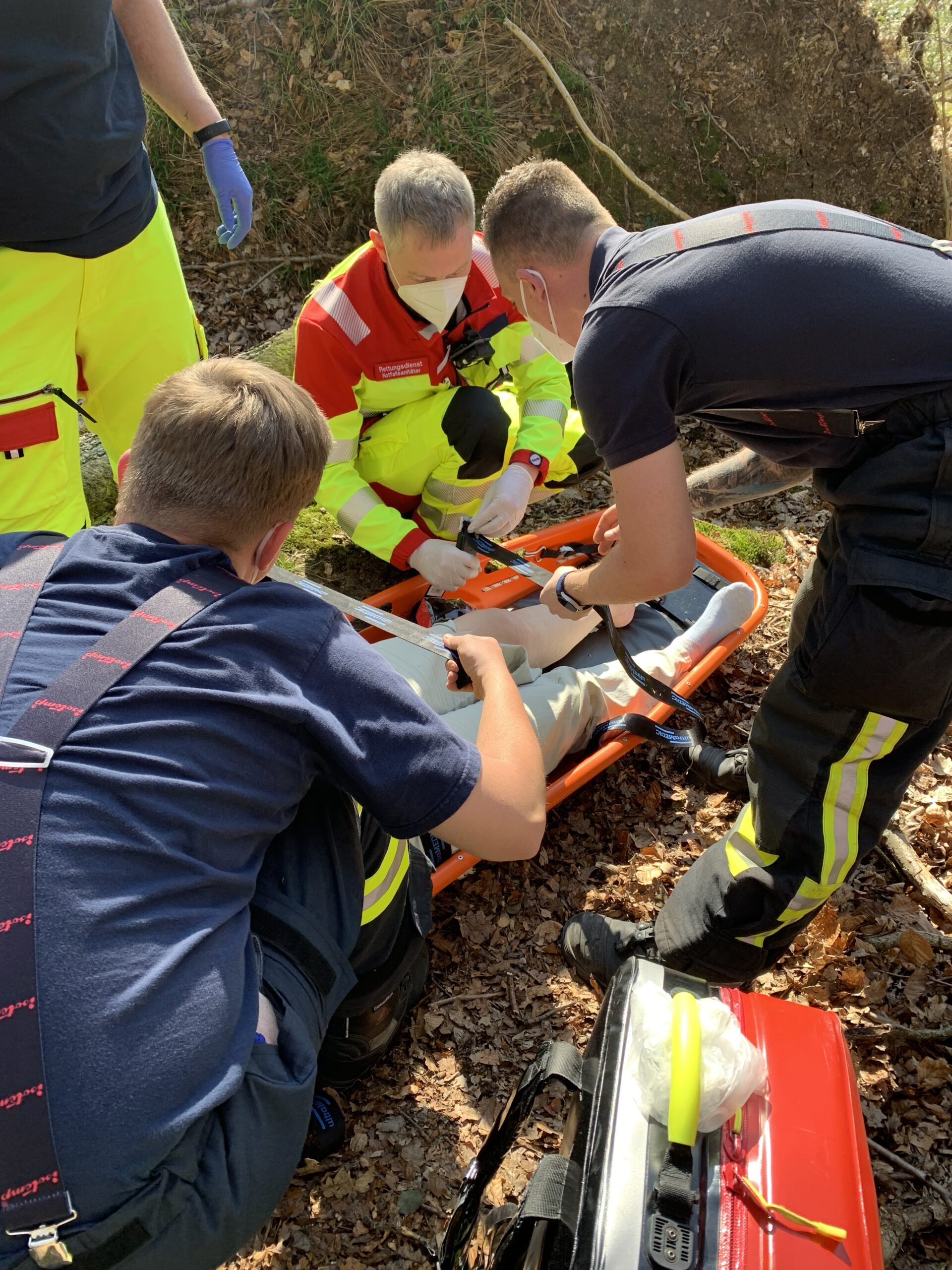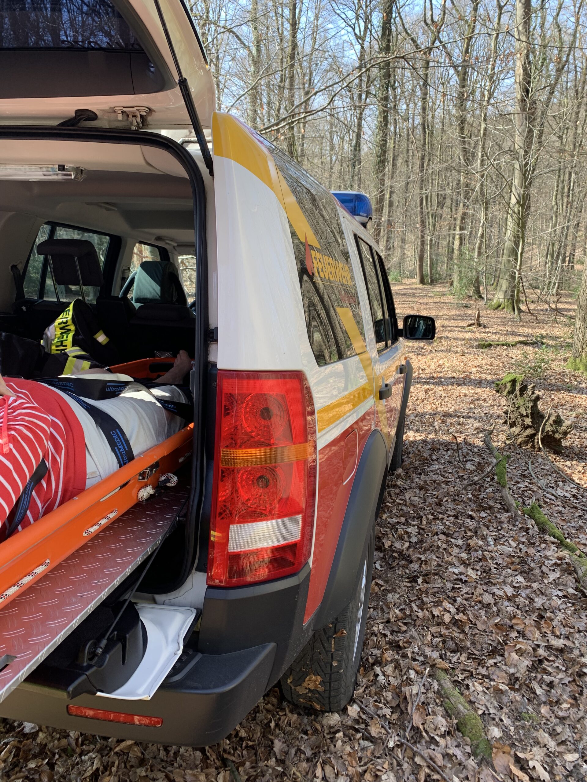konnte im Anschluss die Rettungskräfte in das unwegsame Waldgelände führen, wo die Patientin in ca. 300m Entfernung lag und wartete. Die Feuerwehr hat hierfür auf der Hauptwache einen speziell umgebauten Land Rover im Fuhrpark, der bei solche Fällen umgebaut werden kann, um im Heck des Fahrzeuges, eine Krankentrage fixiert werden kann. Die Feuerwehr baute den Wagen vor Ort um und konnte bis auf 25m zur Patientin vordringen. Im Anschluss wurde sie in eine mitgeführte Schleifkorbtrage fixiert und den ersten Teil durch das Waldgebiet per Hand zum Fahrzeug getragen.