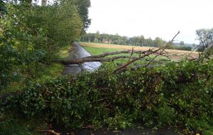 Im Ortsteil Retzen wurde ein weiterer Baum gemeldet. Vor Ort lagen 2 dicke Bäume nebeneinander mitten über der Fahrbahn. Diese wurden mit der Kettensäge zerkleinert und bei Seite geräumt.