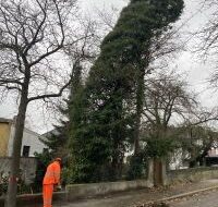 Ein Baum drohte auf parkende Fahrzeuge und ein Haus zu stürzen. Die Feuerwehr zerkleinerte die Fichte mit der Kettensäge und räumte das Holz bei Seite. |