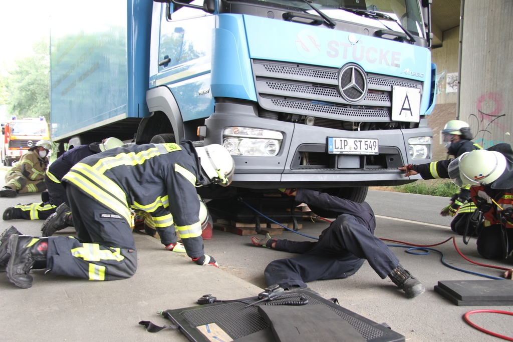 Im Ortsteil Ahmsen hat es derweil gekracht. Ein Lastwagenfahrer hat zwei Radfahrer in Höhe der Straße Meerbrede überfahren und seinen Wagen erst unmittelbar unter der Brücke zur Bundesstraße 239 gestoppt. Beide Radfahrer – in dem Fall zwei zirka 60 Kilogramm schwere Puppen – wurden unter dem Fahrzeug eingeklemmt. Thorsten Keunecke wies die Einsatzkräfte zunächst im Hausmeisterkittel in der Rolle als LKW-Fahrer in die Situation ein, um nur Minuten später in seine eigentliche Funktion bei der Übung zurück zu wechseln. Als Übungsbeobachter schaute er bei den Abläufen seiner Kameraden sehr genau hin und führte Protokoll. „Uns geht es nicht darum irgendwen bloßzustellen, sondern jeder Einheit aufzuzeigen, wo sie noch besser werden kann“, sagte der Einheitsführer der Löschgruppe Biemsen-Ahmsen. Dabei gingen alle Gruppen sehr strukturiert vor und befreiten die beiden verunfallten Puppen rasch aus ihrer misslichen Lage.