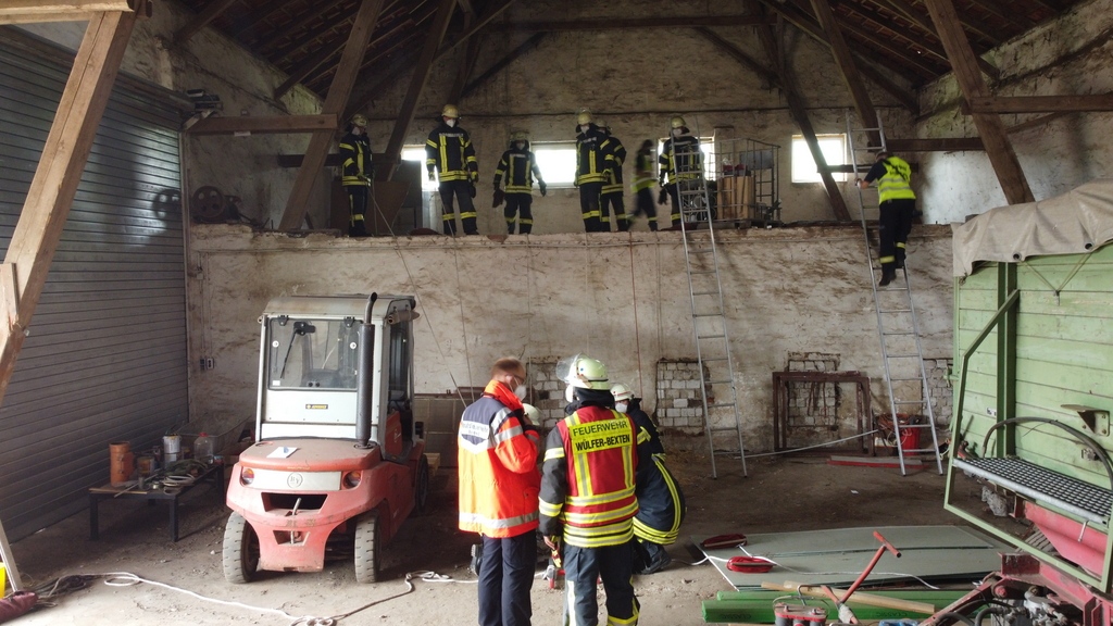Nur einen Steinwurf vom schweren Unfall an der Meerbrede entfernt wurden die Feuerwehrkameraden durch den ELW auf einem Bauernhof an der Stadtgrenze zum benachbarten Herford alarmiert. Hier benötigte der Rettungsdienst die Hilfe der Feuerwehr, um eine ebenfalls verunfallte Puppe schonend von einer etwa drei Meter hohen Empore zu retten. Das gestaltete sich schwierig, wog die „Person“ rund 90 Kilogramm und befand sich in ungünstiger Lage. Axel Sander, der die Einsatzstelle begleitete „juckte“ es sprichwörtlich in den Fingern, um nicht selbst mit anzufassen. Dabei durften die Einsatzkräfte durften bei der Rettung nur auf die Hilfsmittel zurückgreifen, die sie auf dem Fahrzeug mit sich führten. Kreativität war gefordert, um die Aufgabe zu meistern.