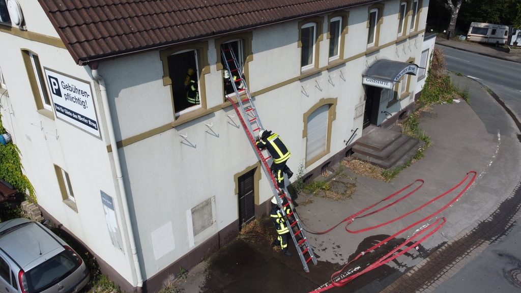 Aus dem ehemaligen „Werler Krug“ war von der Bundesstraße 239 eine deutliche Rauchentwicklung zu sehen. Am Fenster rief eine junge Frau um Hilfe, sie und ihre Mutter im Hinterzimmer waren vom vermeintlichen Feuer eingeschlossen. Die Einsatzkräfte mussten einige verschlossene Türen aufhebeln, um zu den eingeschlossenen Frauen und im späteren Verlauf auch zum Brandherd zu kommen. Während in der Übung zwei Heimrauchmelder „geplant“ durch künstlichen Nebel auslösten, gab es für die Feuerwehr Bad Salzuflen im vergangenen Jahr 16 Realeinsätze unter diesem Alarmstichwort. Vier Mal brannte es wirklich. „Das zeigt, dass die Übung ein durchaus realistisches Szenario ist“, betont Übungsleiter Dominik Kerscher.