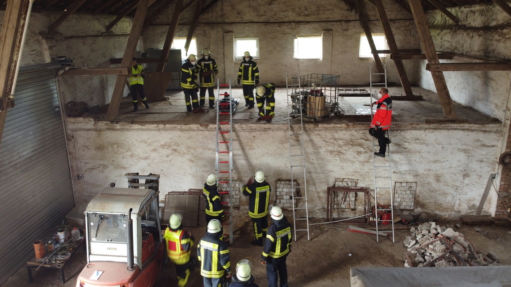 Nur einen Steinwurf vom schweren Unfall an der Meerbrede entfernt wurden die Feuerwehrkameraden durch den ELW auf einem Bauernhof an der Stadtgrenze zum benachbarten Herford alarmiert. Hier benötigte der Rettungsdienst die Hilfe der Feuerwehr, um eine ebenfalls verunfallte Puppe schonend von einer etwa drei Meter hohen Empore zu retten. Das gestaltete sich schwierig, wog die „Person“ rund 90 Kilogramm und befand sich in ungünstiger Lage. Axel Sander, der die Einsatzstelle begleitete „juckte“ es sprichwörtlich in den Fingern, um nicht selbst mit anzufassen. Dabei durften die Einsatzkräfte durften bei der Rettung nur auf die Hilfsmittel zurückgreifen, die sie auf dem Fahrzeug mit sich führten. Kreativität war gefordert, um die Aufgabe zu meistern.