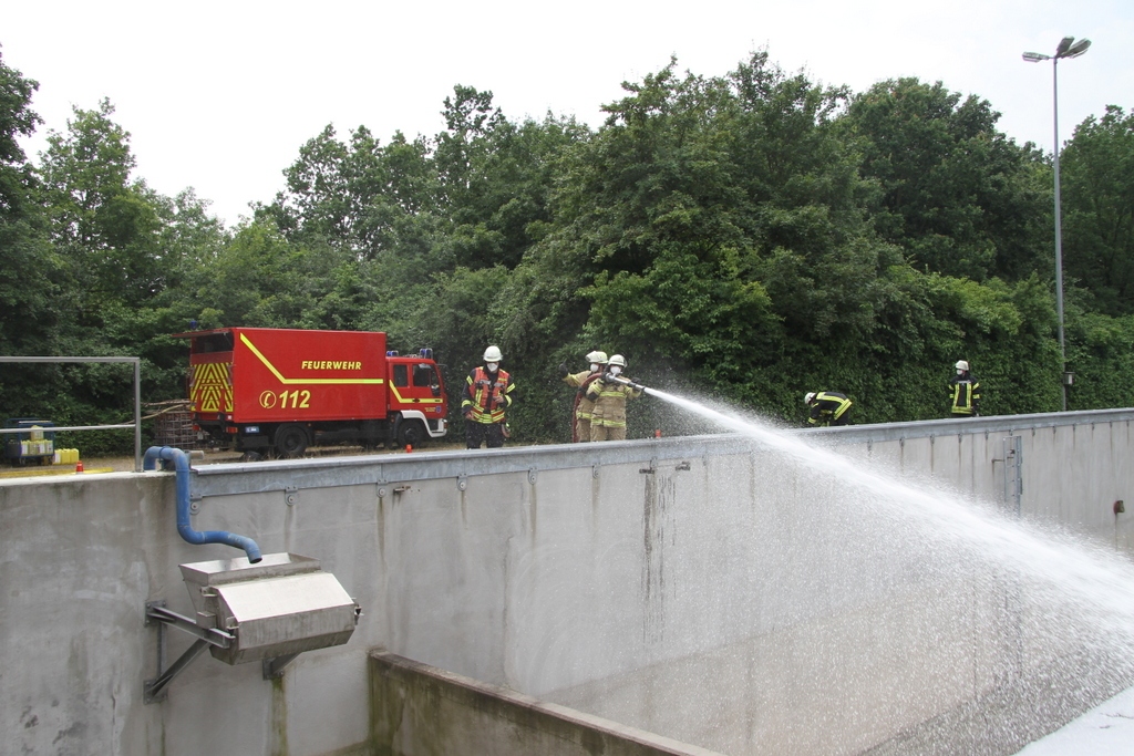 An der Platanenstraße, unweit der Lockhauser Brücke, galt es für die Feuerwehrleute einen vermeintlichen Reifenbrand in einer Mulde zu löschen. Anwohner hatten in dem Szenario nach das Feuer bereits selbst unter Kontrolle gebracht, für die Wehrleute galt es die Reifen zu kühlen, um ein wieder anfachen zu verhindern. Mittels Schaummittel und Wasser wurden sie der Lage schnell her. Andre Schüler als Verantwortlicher für die Einsatzstelle beobachtete und notierte fleißig.
