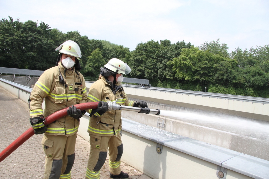 An der Platanenstraße, unweit der Lockhauser Brücke, galt es für die Feuerwehrleute einen vermeintlichen Reifenbrand in einer Mulde zu löschen. Anwohner hatten in dem Szenario nach das Feuer bereits selbst unter Kontrolle gebracht, für die Wehrleute galt es die Reifen zu kühlen, um ein wieder anfachen zu verhindern. Mittels Schaummittel und Wasser wurden sie der Lage schnell her. Andre Schüler als Verantwortlicher für die Einsatzstelle beobachtete und notierte fleißig.