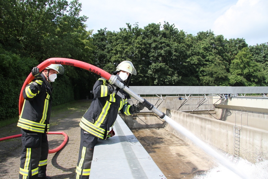 An der Platanenstraße, unweit der Lockhauser Brücke, galt es für die Feuerwehrleute einen vermeintlichen Reifenbrand in einer Mulde zu löschen. Anwohner hatten in dem Szenario nach das Feuer bereits selbst unter Kontrolle gebracht, für die Wehrleute galt es die Reifen zu kühlen, um ein wieder anfachen zu verhindern. Mittels Schaummittel und Wasser wurden sie der Lage schnell her. Andre Schüler als Verantwortlicher für die Einsatzstelle beobachtete und notierte fleißig.